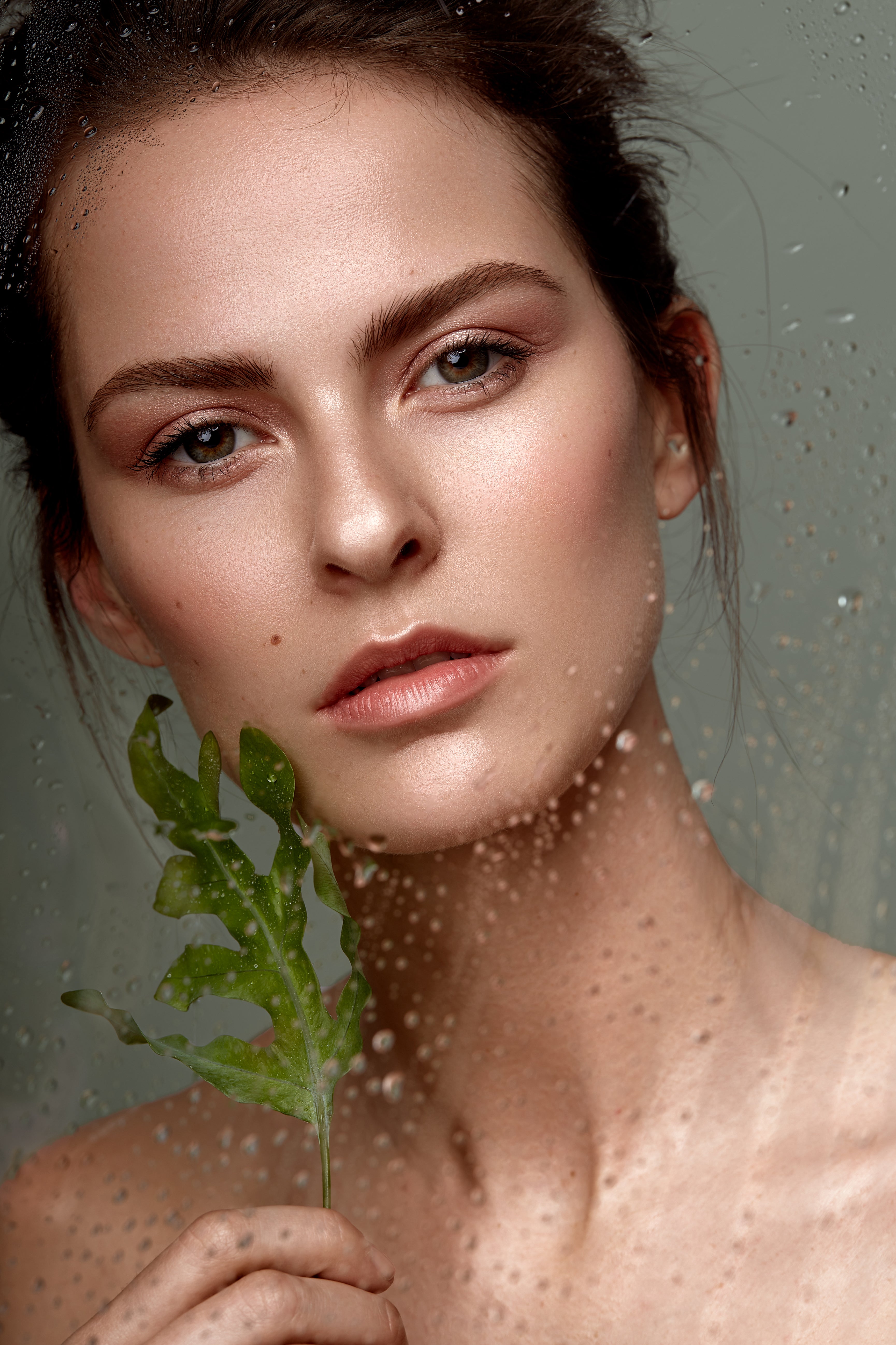 Frau mit Eis in der Hand und dunklen Haaren mit Nude Makeup Look